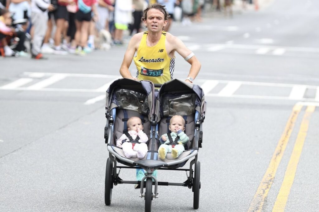 Yes, Nathanael Williams: metallurgist by day, coach by afternoon, and running dad—mostly in the early morning. He isn’t just lacing up for the Novant Health Charlotte Marathon… he’s aiming for the fastest half marathon while pushing a double stroller. “A couple of weeks before the Around the Crown 10K, I did a faster run with the double stroller and thought, ‘Maybe I could run fairly fast, even with the double,’” he told us. He clocked 33:32 that day; good enough for 18th overall. That’s seriously fast, even without extra passengers.